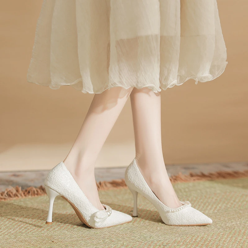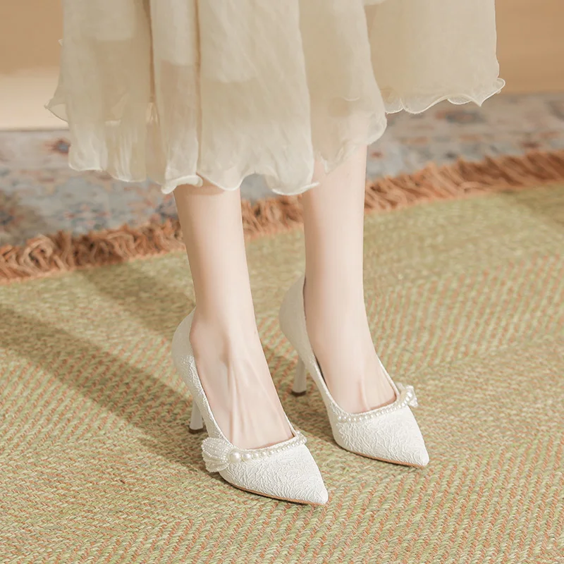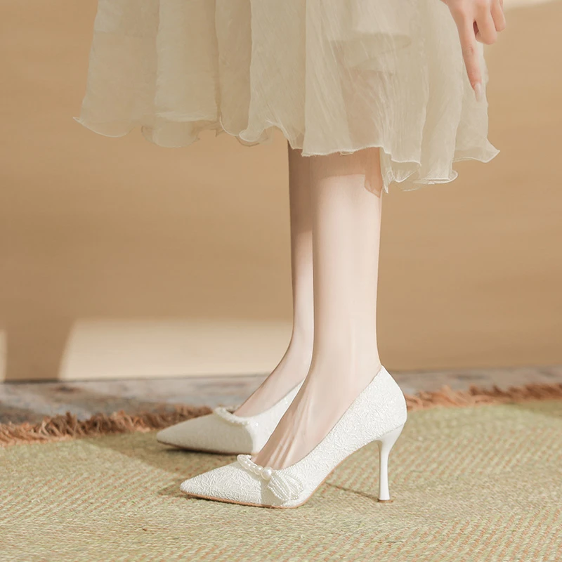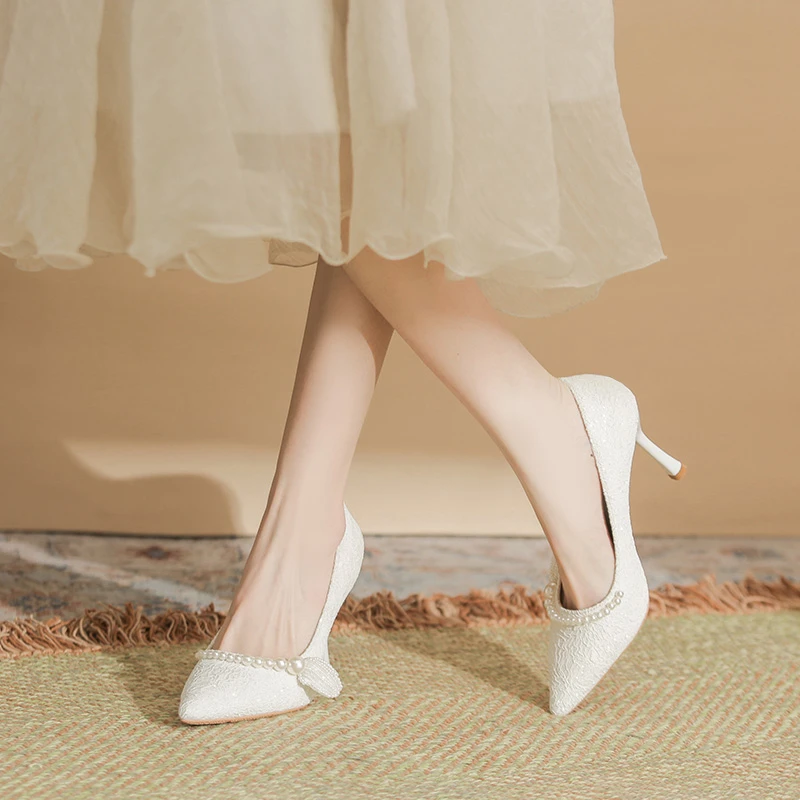 Stylish White Solid Lace Pumps with Pointed Toe Stiletto Heel Pearl and Lace Accent Height Increasing Wedding Bridal Shoes
